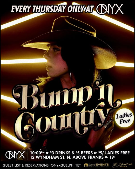 Onyx is going country! Bringing you the best country bar nights in Guelph This Thursday. Put on your boots, grab your hat, and join us for a night of dancing, drinking, and having a good time. You don’t want to miss this! **LADIES FREE** **$3 Drinks** **$5 BEERS**