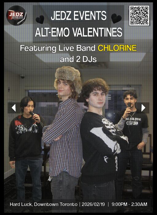 Join 300+ students & young adults for a limited-cap emo/alt night. 2 DJs + Live band: CHLORINE πΈ This one will sell out. πΊ Bar & Coat check available (venue-run) π« No outside drinks π No Smoking or vaping inside When: Thursday, February 19 Time: 9:00 PM β 2:30 AM Where: Hard Luck Bar, 772A Dundas Street West Dress: Black/White/Red/pink π€π€β€οΈπ©· | Band tees | Emo / Alt fits encouraged Entry: β 18+ to enter | 19+ to drink β Government photo ID required β Professional security on site If youβre past your 20s, this event might not be for you. ποΈ Tickets only, aka no door entry. Unfortunately, no refunds for any reason.