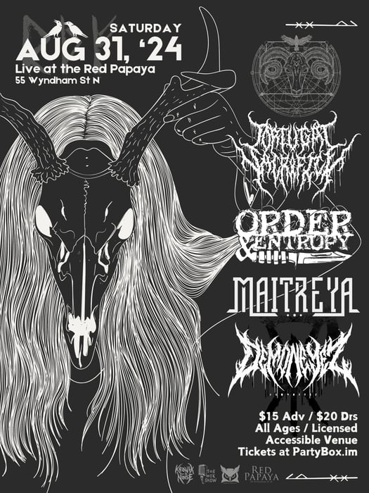 KronikNoise Promotions is proud to present the Tortugal Sacrifice Hometown Banger live at the Rage Papaya this August! Tortugal Sacrifice Order & Entropy Maitreya Demon Eyez AUGUST 31st, 2024 8pm Doors $15 Advance / $20 at Doors - As always this is a pay by donation show All Ages & Licensed Event Accessible Venue