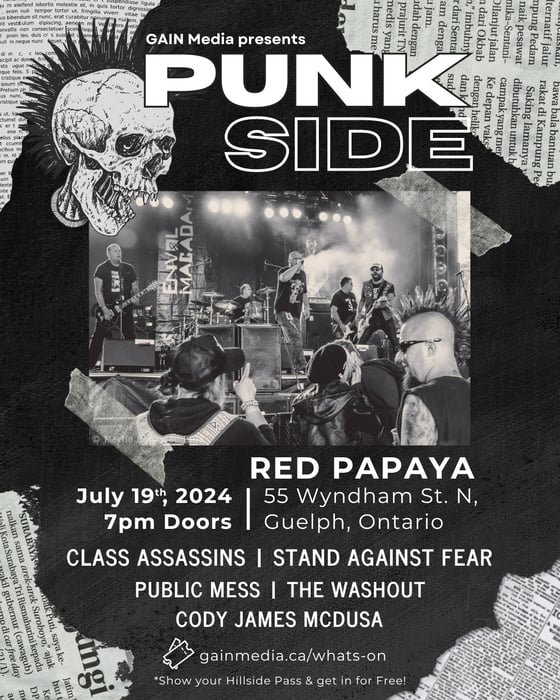 Need more punk in your life?! Hit up the Red Papaya inside the Quebec St Mall on Friday, July 19th for this year's Punkside featuring a variety of local punk & folk punk acts! The Class Assassins - Toronto Stand Against Fear - Guelph Public Mess - Toronto The Washout - Hamilton Cody James McDusa - Guelph