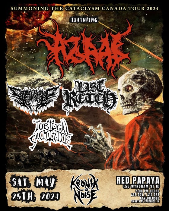 KronikNoise Promotions Presents The 'Summoning The Cataclysm Canada Tour 2024' Featuring AZAAB - Pakistan LAST RETCH - Hamilton CATASTROPHIC HEMORRHAGE - Brantford TORTUGAL SACRIFICE - Guelph SATURDAY, MAY 25 , 2024. @ RED PAPAYA (55 Wyndham St N) GUELPH, ON 8PM DOORS 9PM BANDS ALL AGES HORNS HIGH FUCKERS ๐ค๐ฅ๐ค