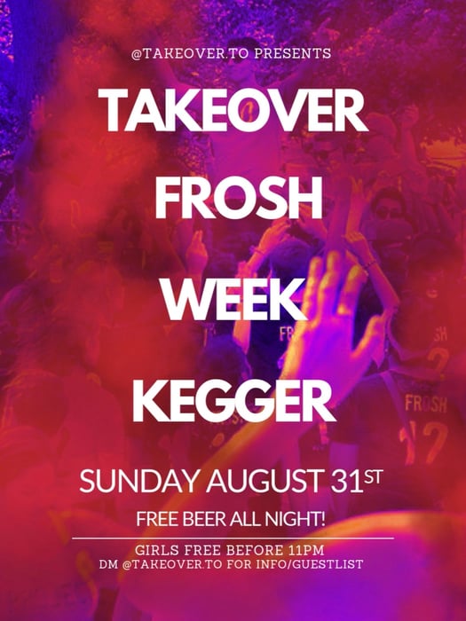 ๐ฅ@takeover.to is officially back to business. Kick off the school year with the biggest frosh party on campus ๐ฅ ๐๏ธ Sunday August 31st doors open at 9pm ๐ป Free drinks all night ๐๏ธ Guys DM @takeover.to for pricing - Girls free until 11pm ๐ฃ DM @takeover.to for Guest List and More Information ๐ฃ #TAKEOVER TAKEOVER FROSH KEGGER - things to know before coming - Address is 365 Murray Ross pkwy unit 70 - Sunday August 31 2025 - Doors open 9pm - Entrance at front door - first come first serve until capacity - Entrance for guys starting at $20 - Entrance for girls - free until 11pm - All entrance fees subject to change with capacity - Cash / ET accepted - Id with birthdate required (18+ to enter, must be 19+ to drink inside) - Free beer for the whole night - Shots can be bought for cash - Follow and dm @takeover.to to be added to guest list (fills fast) Please keep an eye on @Kappasigma.yu and @takeover.to page on insta we will be posting there when the party gets full