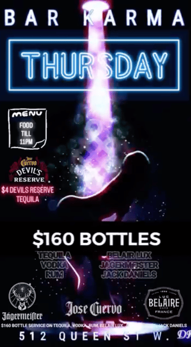 Bar Karma Thursday $4 devils reserve tequila drink special DRESS CODE : NO SWEATPANTS, DURAGS, OR NON RELIGIOUS HEAD COVERINGS
