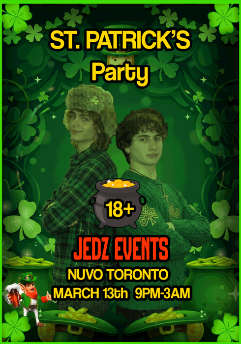 Join a MASSIVE 700+ students & young adults for an epic St. Patrick’s themed celebration! 4 DJs playing all night 🍺 Bar & Coat check available (venue-run) 🚫 No outside drinks When: Friday, March 13th Time: 9:00 PM – 3:00 AM Where: Nuvo Toronto, 4749 Keele St, North York, ON M3J 2N9 Dress: GREEN!!! 🍀 Prize for the best leprechaun. Entry: – 18+ to enter | 19+ to drink – Government photo ID required – Professional security on site If you’re past your 20s, this event might not be for you. 🎟️ Tickets only, aka no door entry. Unfortunately, no refunds for any reason.